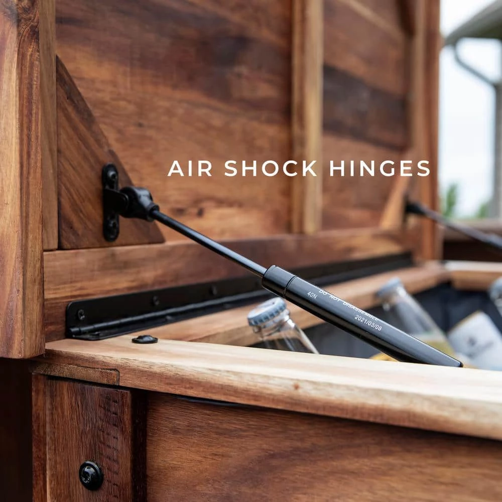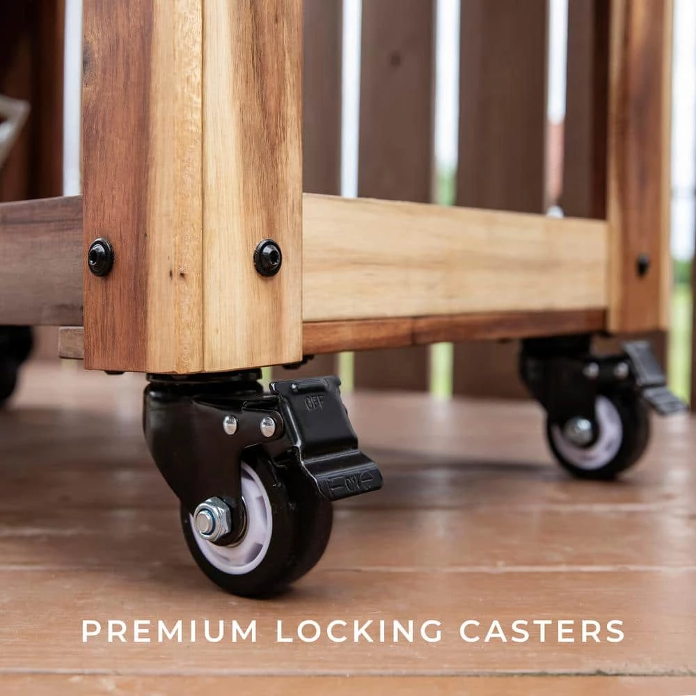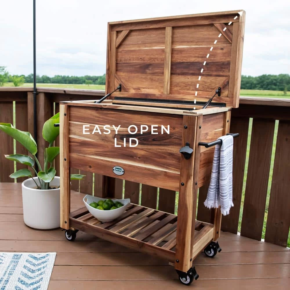 Finally, a cooler that beautifully blends form and function for your outdoor life. Made with long-lasting Acacia wood that is dense and naturally water resistant, this cooler is a multipurpose masterpiece. With a 100-Qt. capacity, FDA-approved soft liner, and ability to hold ice for up to 8 hours, there’s plenty of room for a full day or night of entertaining. The top is a solid block surface you can use for prepping food or beverages, and the lid is equipped with air shocks for opening ease. No matter where you want to set up this 100-qt. Acacia wood cooler, it rolls sleekly right along with you thanks to premium locking casters that make movement effortless and sturdy when locked down. Plus, the attached towel racks and bottle opener make sure you have what you need where you need it. When the fun is done and you decide it’s time to go back inside, a waterproof cover is included for year-round protection.
