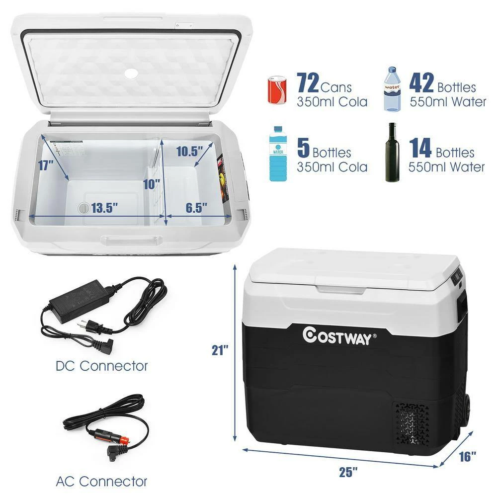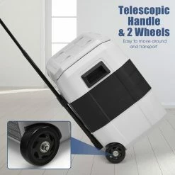 - Portable Design & Wide Application: Featuring 2 large wheels and a pull-up handle, this portable fridge is convenient for you to take anywhere and can be used in various outside activities. In addition, this fridge comes with 2 power cables for 12/24V DC and 100 – 240V AC power inputs, making it suitable for home and car use.