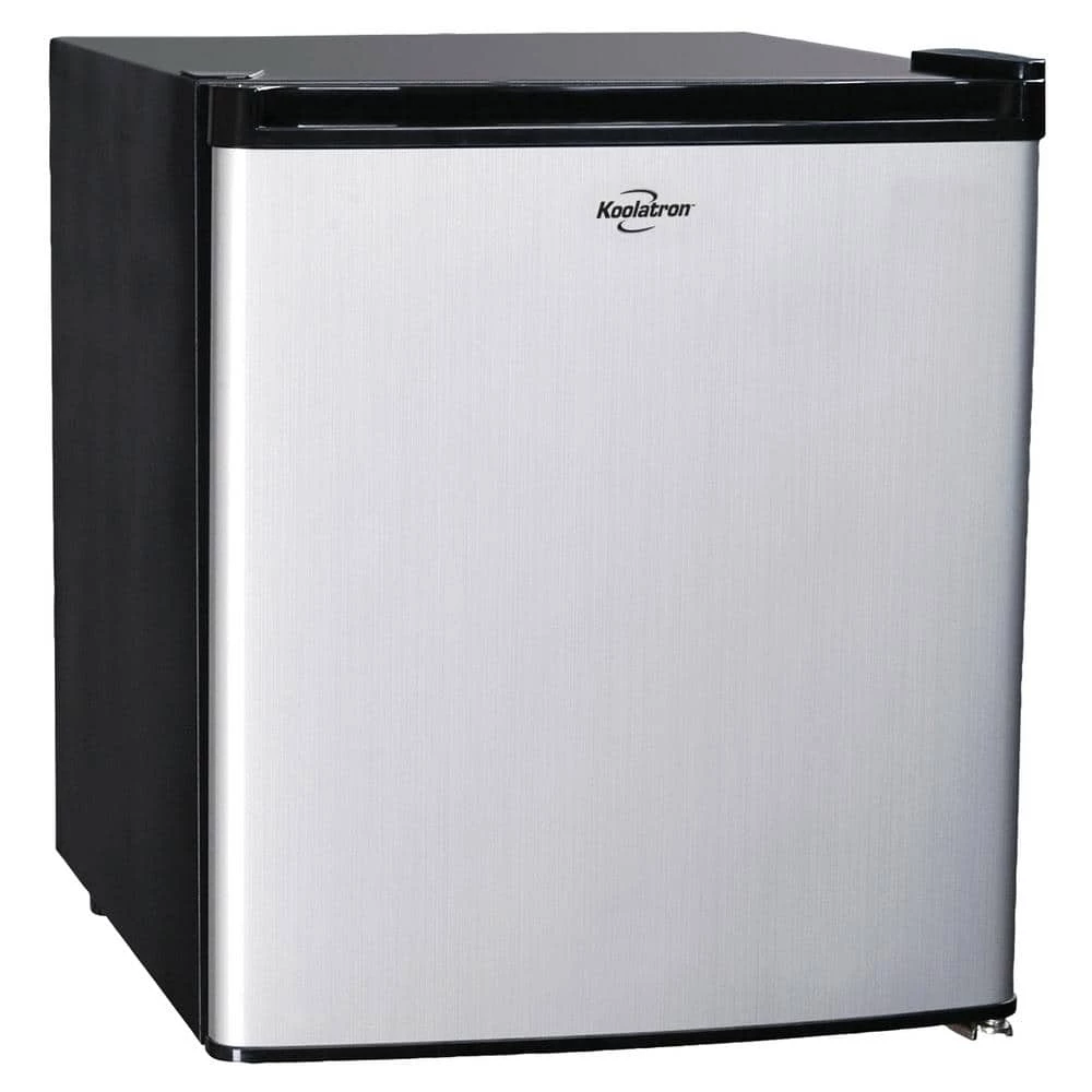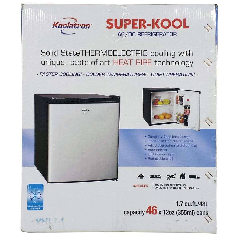 The ideal compact fridge for use in trucks, RVs or boats. The Koolatron 1.7 cu. ft. AC/DC Heat Pipe Fridge provides efficient and powerful cooling in a compact size. This compact fridge/cooler works on 12-Volt AC or 110-Volt AC power (both power cords are included) and uses just 6 Amp of current when operating on your vehicles 12-Volt power. The compact flush-back design makes it an easy fit in small spaces. This compact fridge/cooler features an adjustable temperature control, a removable shelf and an LED interior light. The Koolatron 1.7 cu. ft. AC/DC Heat Pipe Fridge does not have a compressor. It uses solid state thermoelectric heat pipe technology to cool the contents of the fridge up to 45°F or 25°C below surrounding temperature. How does thermoelectric cooling work. The solid state thermoelectric module acts as a heat pump to remove heat away from the fridge. The heat from the thermoelectric module is absorbed by the heat pipe, vaporizing the liquid refrigerant and rapidly moving heat away from the source, allowing for faster temperature drop. This technology has been widely used by the military, aerospace and computer industries primarily for rapid heat transfer.