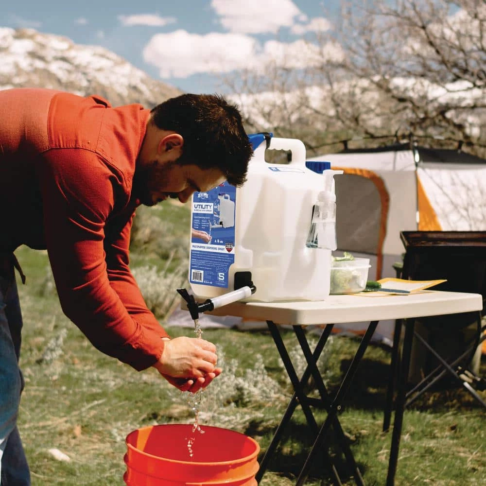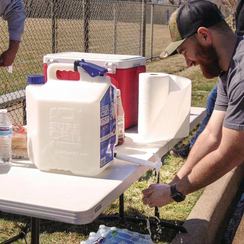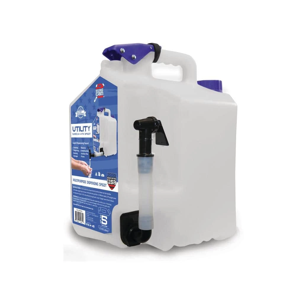 The 5 Gal. Utility SureCan Water Station was designed to be the most versatile all-purpose water jug on the market. Built with SureCan’s innovative bottom feed technology and legendary toughness, the rotating spigot provides a fast-convenient dispensing experience that is unmatched. Simply fasten the Velcro strip to the thumb button and you are ready to go. Rotate the spigot down 90° for a convenient dispensing experience. When done, rotate the Spigot back into the resting position for storage and transportation. The portable Utility SureCan with Spigot provides convenience for Drinking water, washing hands, rinsing food or objects and filling pet water bowls. (Not intended for fuel-based liquids)