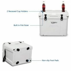 - ?HUMANIZED DESIGN?There are 2 built in cup holders and fish ruler on the top, making it can not only work as a cooler but also a table or stool in outdoor activities