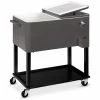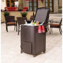 The Cooler Station® Patio Cooler from Suncast® is the perfect accessory for outdoor entertaining. The 77 quart capacity can hold up to 72 beverage cans or 6 two-liter bottles. A wire basket and lower cabinet are included to provide additional storage for serving supplies and accessories, as well as a towel bar on the side for quick clean up. This product also features 4 swivel casters to easily roll away once the party has come to an end. Not only is this cooler perfect for entertaining, but its stylish resin wicker design will look great on your patio too!