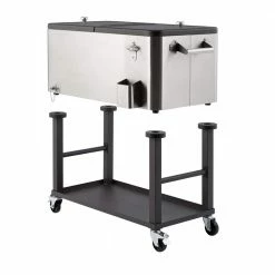 Entertain in style with an 80 Qt./20 Gal./96 aluminum can capacity. This sleek stainless steel cooler/ice cart has a detachable tub so you have the option of keeping the cooler mobile, or detaching for easy portability to any game, party, or event. Bottle opener and cap catcher make for easy bottle opening, and the bottom shelf provides extra storage space allowing for easy refills, or anything else that needs to be carted outside.
