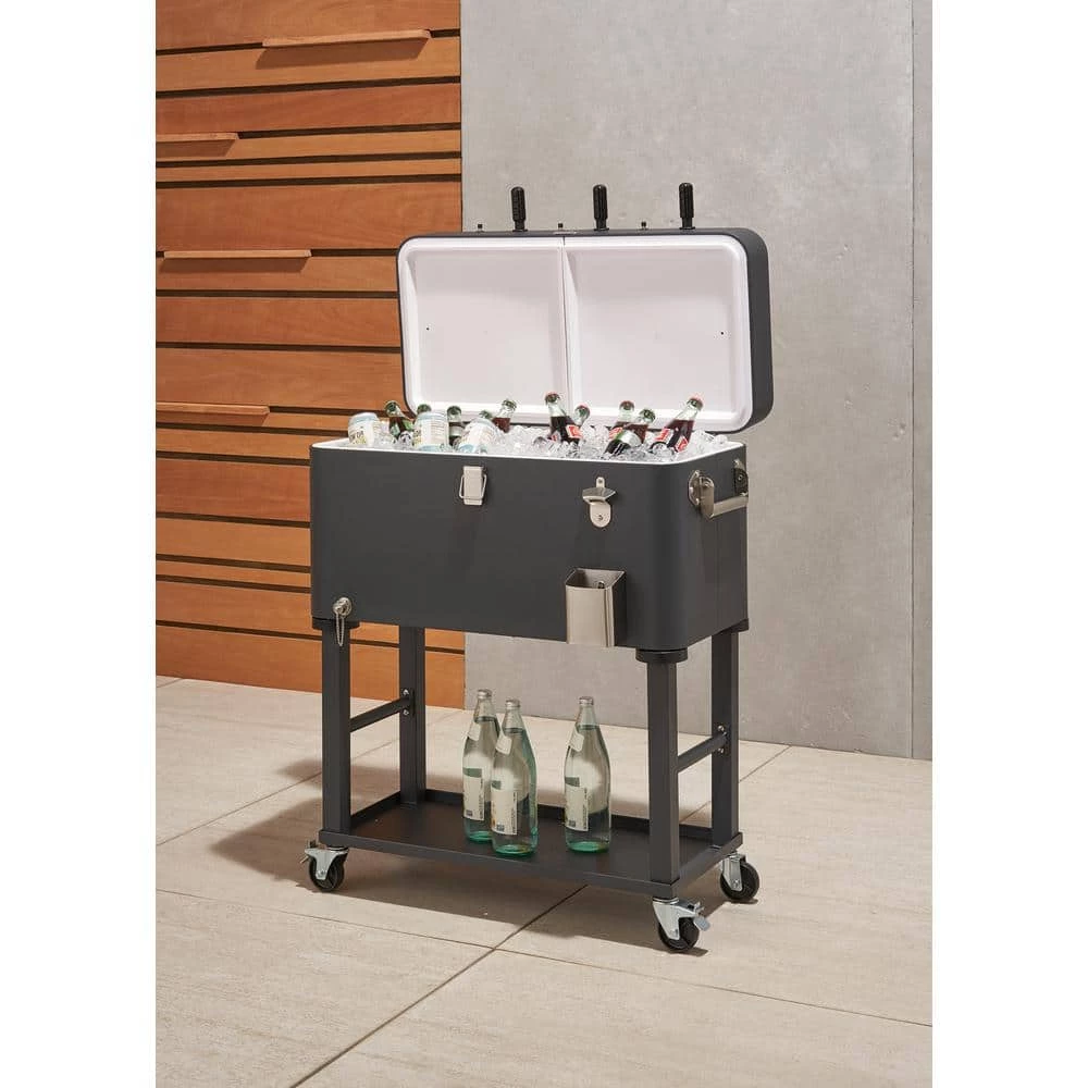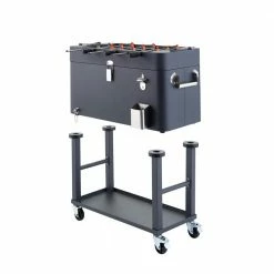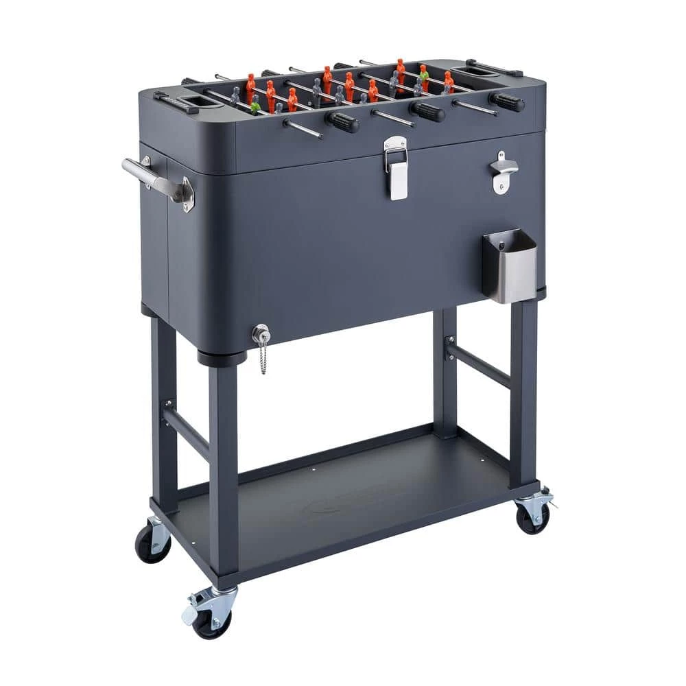 Bring life to any party with a game of foosball! This Foosball cooler will not only keep your drinks cold, but your guest entertained. With an 80 quart / 20 gallon / 96 aluminum can holding capacity and detachable tub, this cooler is mobile friendly and perfect for any game, party, or event. The bottle opener and cap catcher make for easy bottle opening, and the bottom shelf provides extra storage space to store refills. The cooler cover is both water and UV resistant and will keep your cooler protected when stored in the elements. You don’t have to worry about serving warm drinks or bored guests with this foosball cooler!