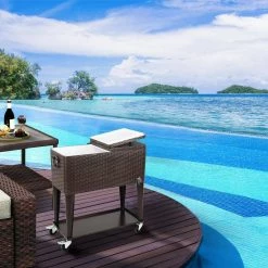 - Directional Wheels: Patio Cooler Cart equipped with 4 wheels which allow you to move it anywhere. Rotates 360 degrees for easy transportation. Two wheels with lock keep it in place.