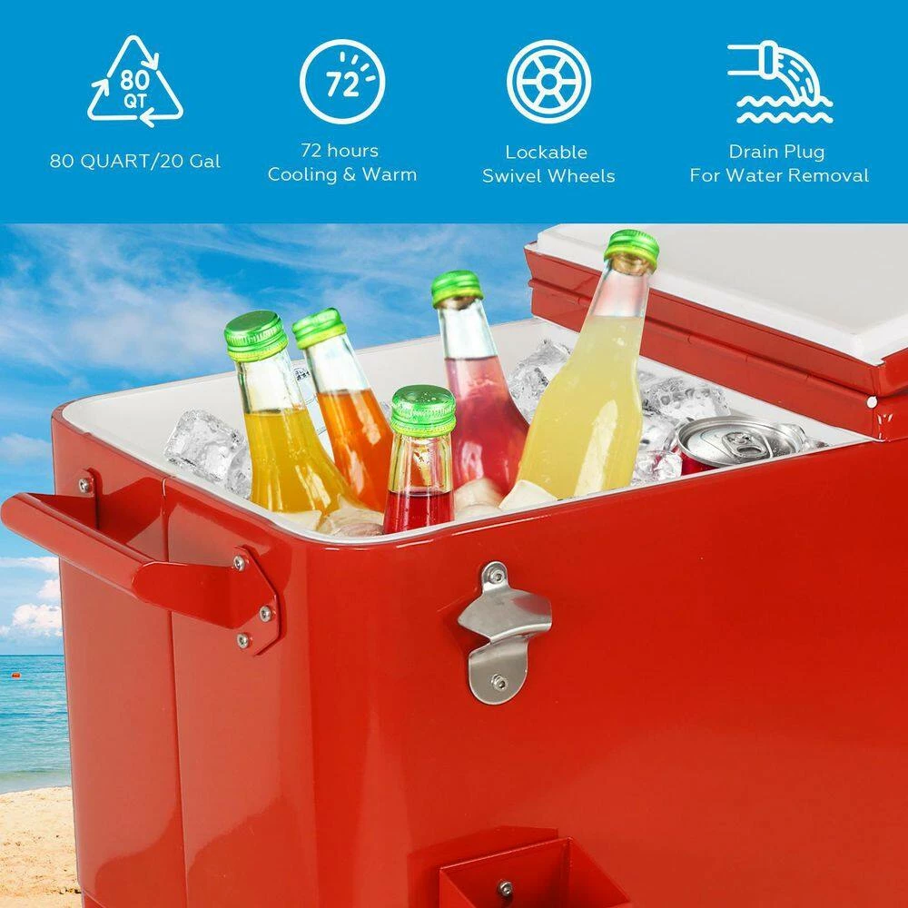 - Premium Materials: Rolling Cooler could keep cold for days. The exterior is powder-coated steel, the interior is PP (Polypropylene) lined injection-foam-unitized, the bottle opener is stainless steel.
