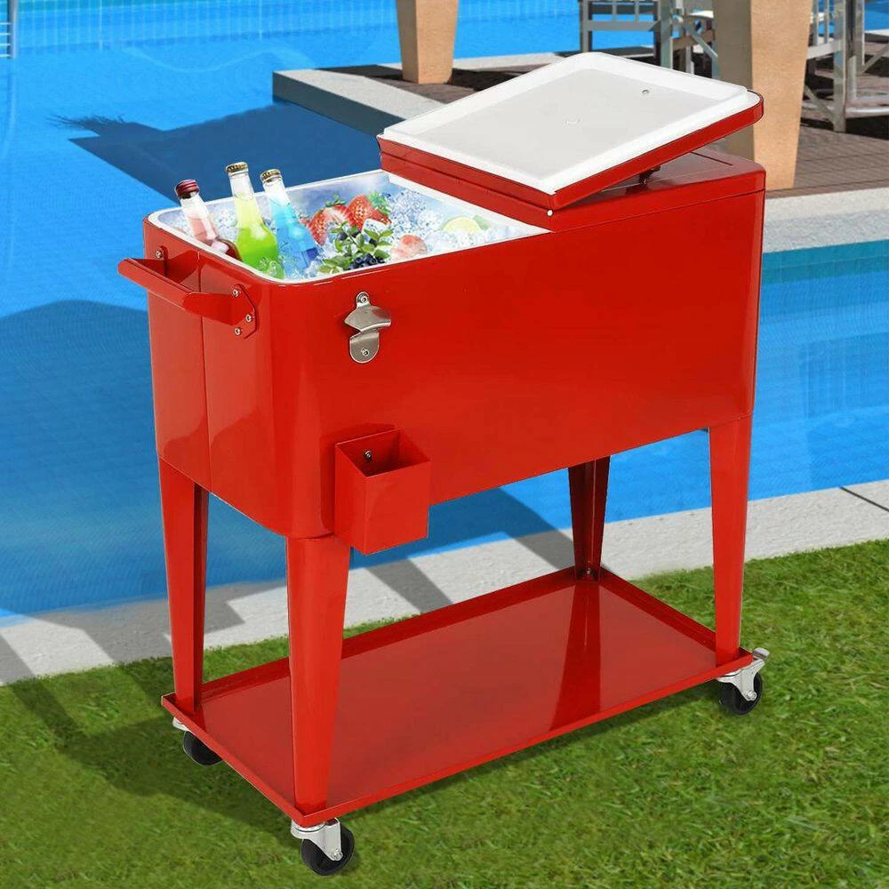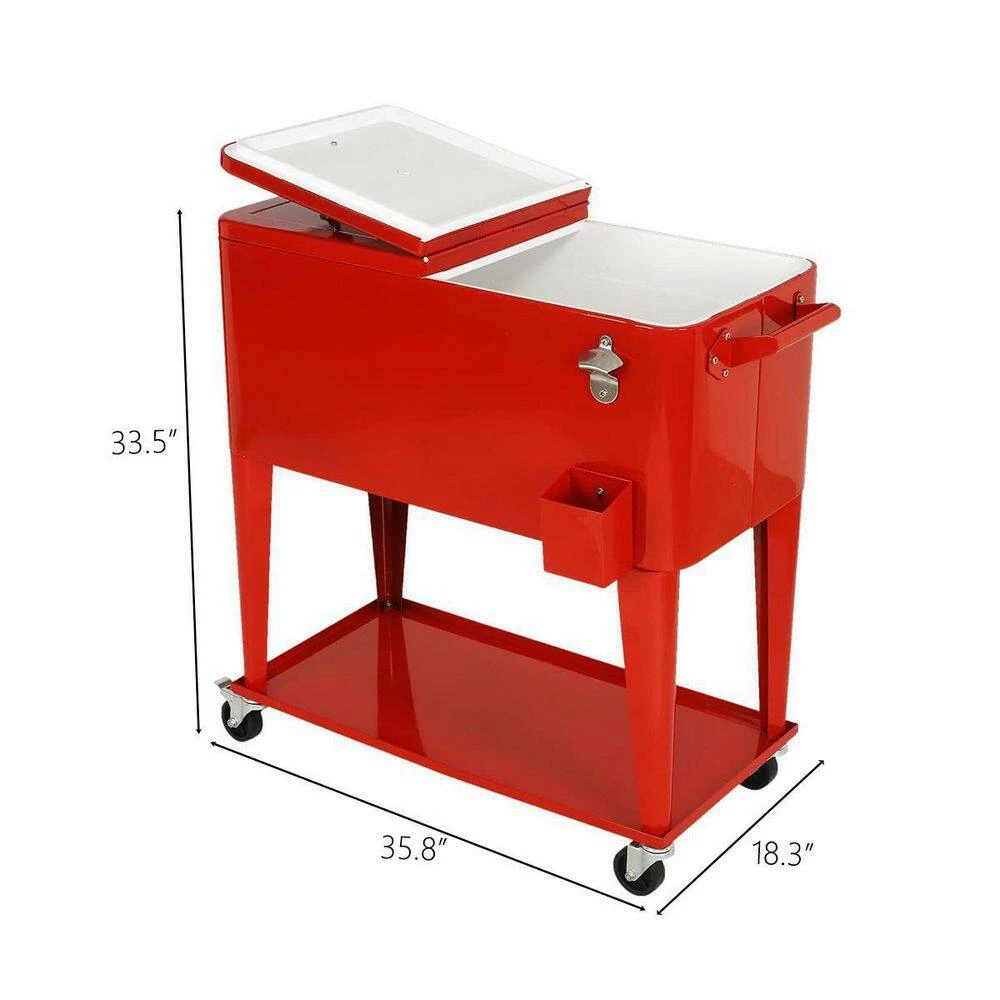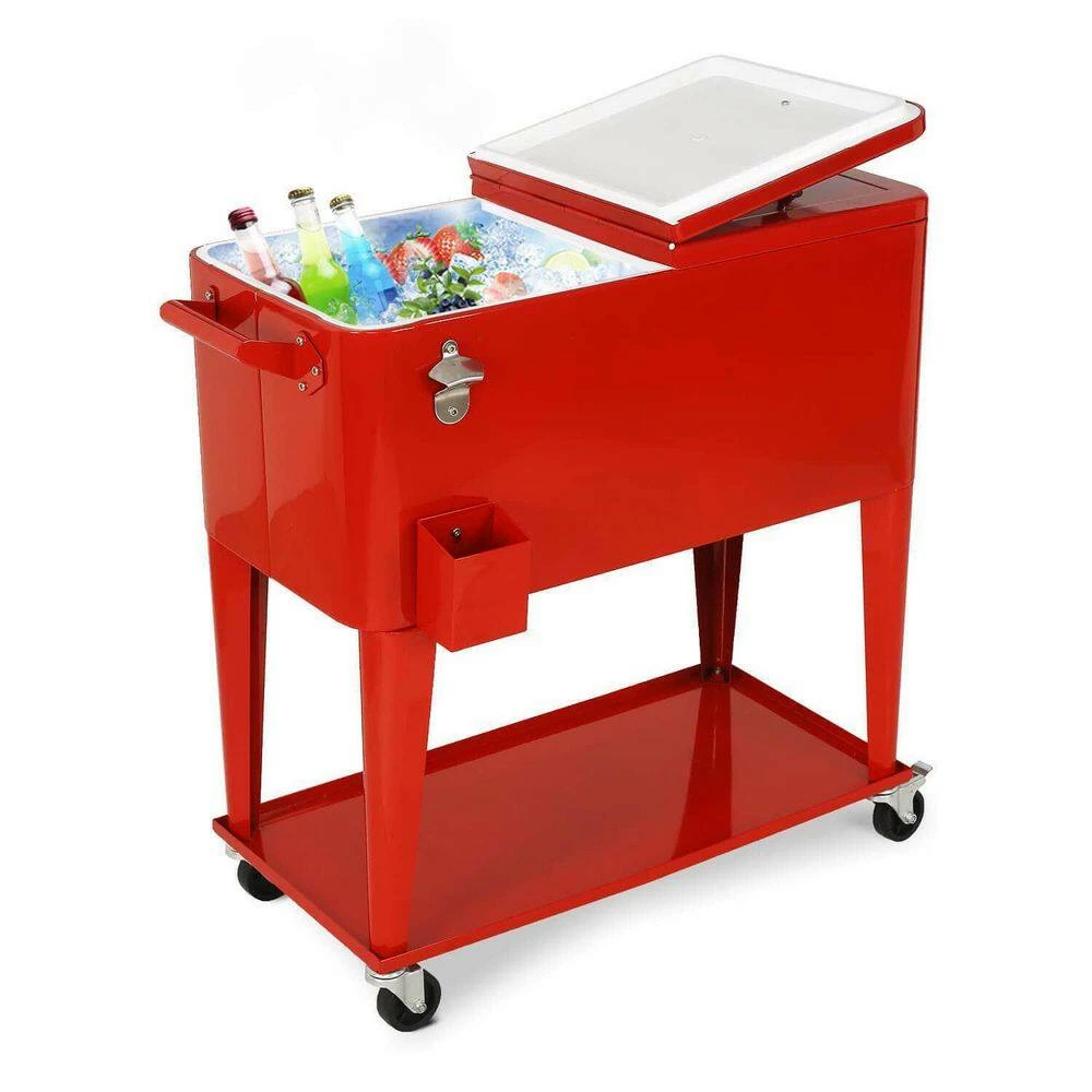 Outddor Cooler Cart could store up to 100 cans/50+bottles and designed with Bottom Shelf which holds extra beverages. This is the best choice for a party and BBQ. Humanization design. The dual top is made for easy opening and closing. Convenient bottle opener and bottle cap catch bin attached to the side. Get your summer started right with this stylish rolling cooler turn your paito from a waste of space to the party gathering place.
