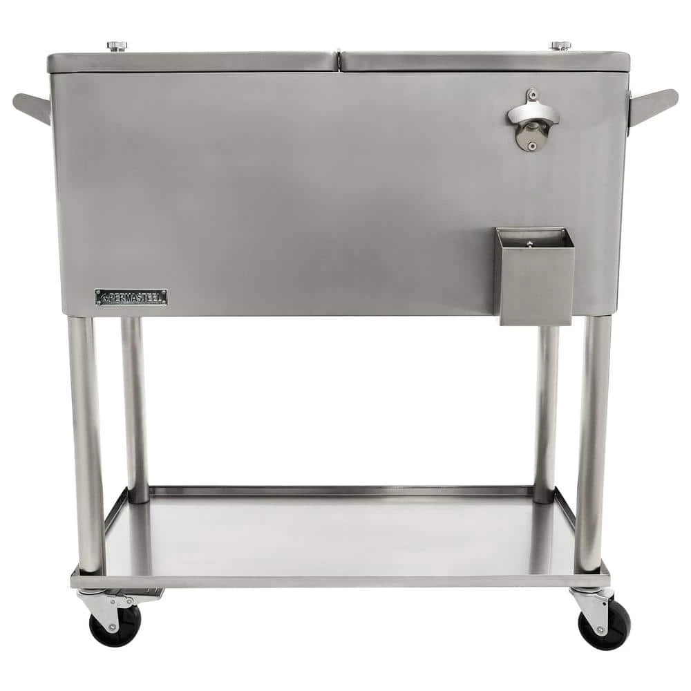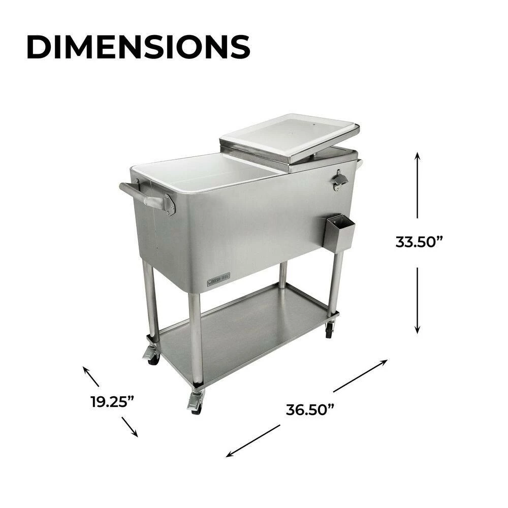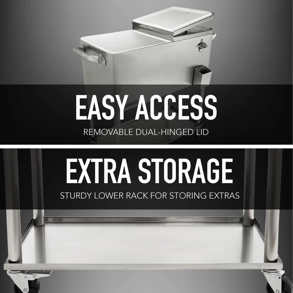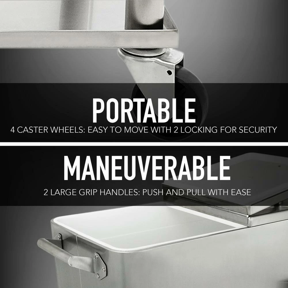 This beautiful and timeless all stainless steel 80 QT Steel Patio Cooler cart will add elegance to any backyard and outdoor patio. Entertain your guests with this beautiful powder-coated steel Patio Cooler that is well constructed with its insulated basin to keep your beverages cold up to 36 hours. It holds up to 110 – 12oz cans with plenty of room for ice. Featuring injected molded insulation to keep your drinks cold for the duration of the party and beyond, powder-coated finish for long life, and split double lid for easy access to cold drinks. Once you have your preferred drink, you can easily pop the cap off with the convenient bottle opener and catch the bottle cap with the included cap catcher. This Patio Cooler includes four heavy-duty casters for easy mobility, two locking for stability once in the desired area. After use, it’s easy to drain the cooler with the build-in stainless steel drain tube & cap.