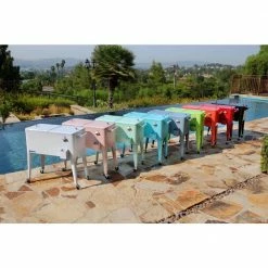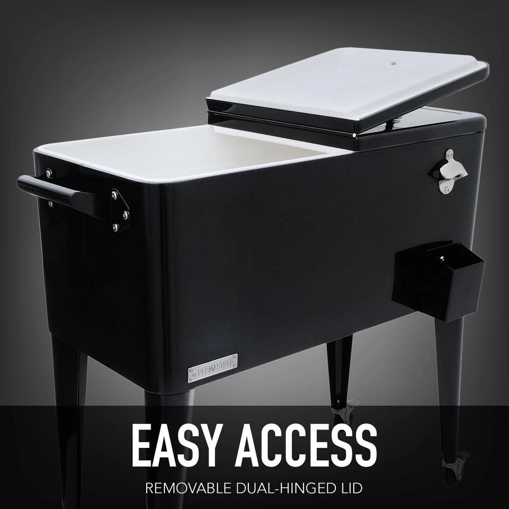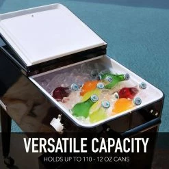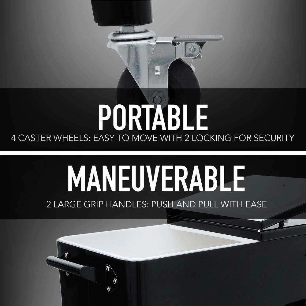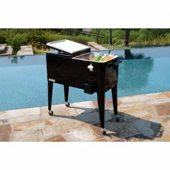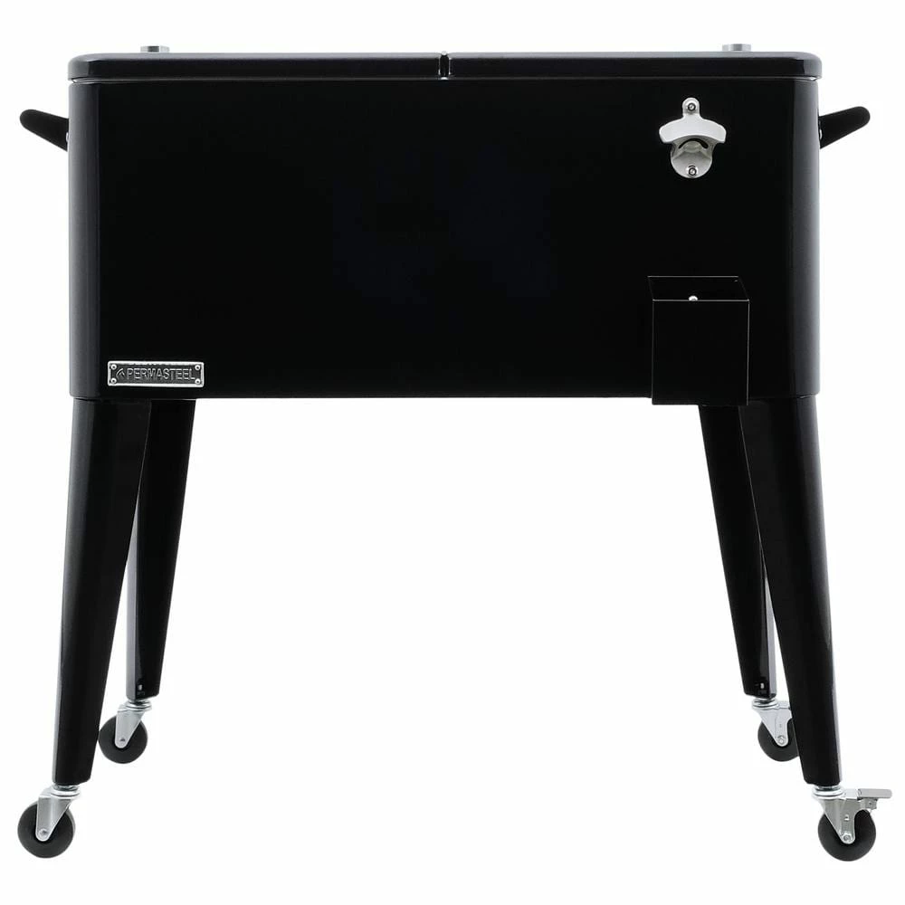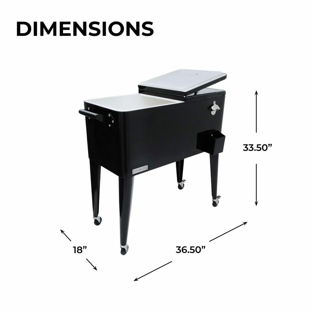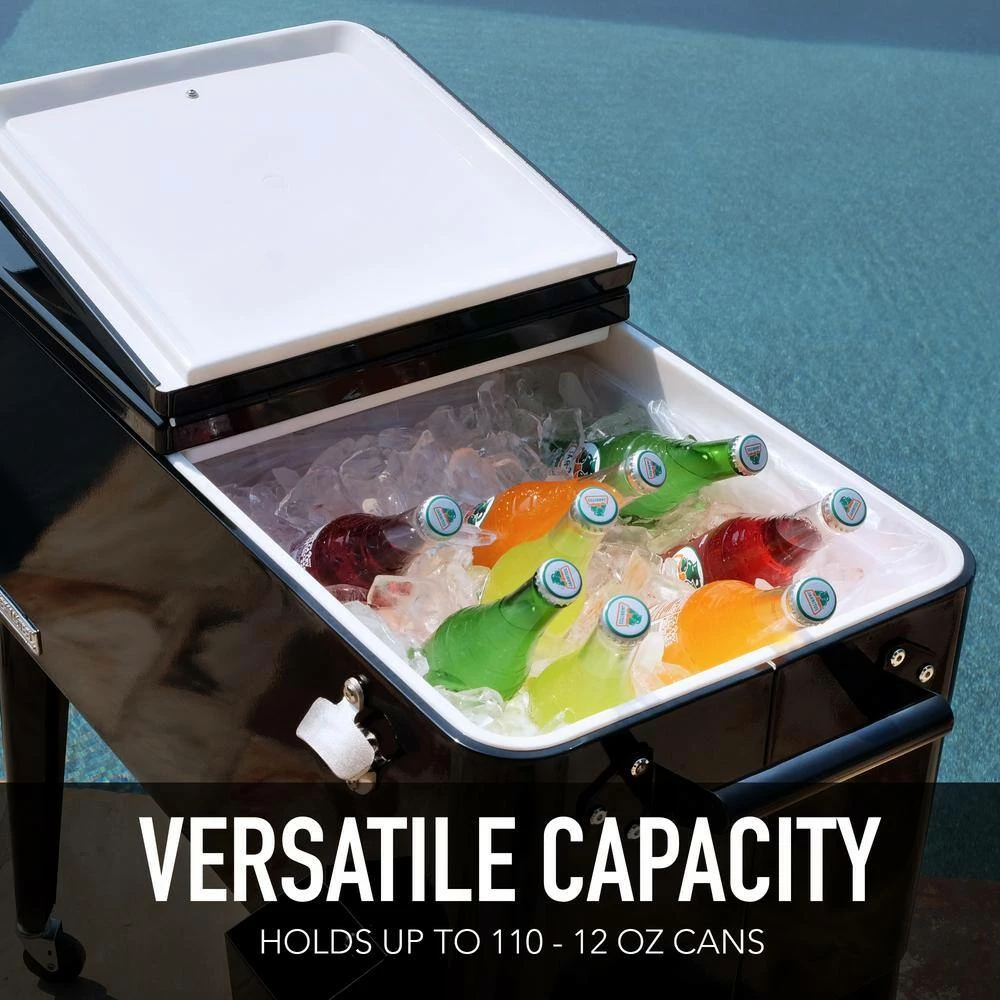 This vintage style 80QT Steel Patio Cooler cart will add elegance to any backyard and outdoor patio. Entertain your guests with this beautiful powder coated steel Patio Cooler that is well constructed with its insulated basin to keep your beverages cold up to 36 hours. It holds up to 110 – 12oz cans with plenty of room for ice. Featuring injected molded insulation to keep your drinks cold for the duration of the party and beyond, powder coated finish for long life, and split double lid for easy access to cold drinks. Once you have your preferred drink, you can easily pop the cap off with the convenient bottle opener and catch the bottle cap with the included cap catcher. This Patio Cooler includes four heavy-duty casters for easy mobility, two locking for stability once in the desired area. After use, it’s easy to drain the cooler with the build in stainless steel drain tube & cap.