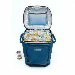 Meet the Coleman® CHILLER™ 42-Can Soft Cooler Bag with Wheels. Whether you’re bringing drinks to the game or keeping the fam fueled on a hike, this cooler’s easy to transport thanks to its telescoping handle and durable wheels. This cooler’s exterior is made from recycled polyester fibers so you’ll help reduce your impact on the environment. Its welded seams prevent leaks for no messes while you adventure, and, if you’re craving a midday snack, its zip front and inner mesh pockets are perfect for storing protein bars, trail mix, and other extras. Once the day is over, this cooler’s antimicrobial* and stain-resistant liner is removable so that cleanup is quick and easy. *This product does not protect users against food-borne bacteria. Clean thoroughly after each use.