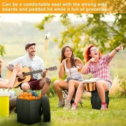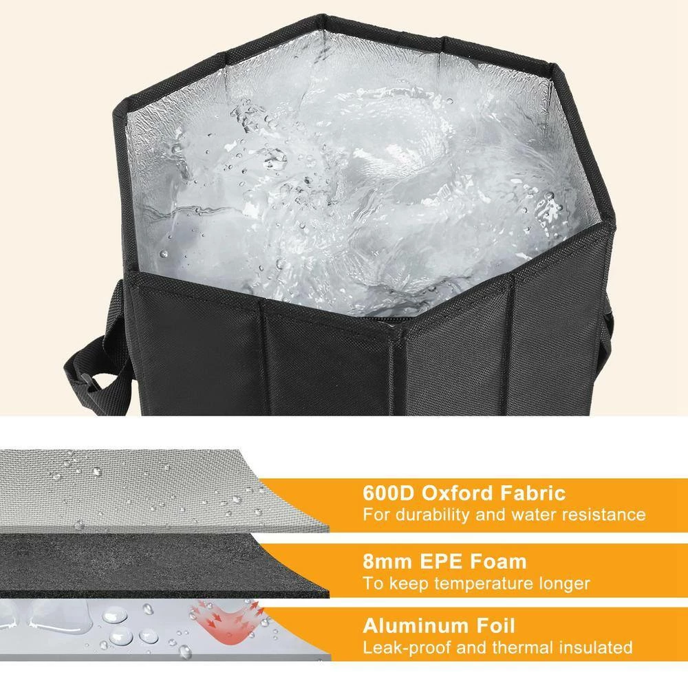 11.8 ft. W x 11.8 ft. D x 11.3 ft. H, accommodates over 12 quarts food storage containers or water bottles than other bags. Our heavy-duty trunk organizer is made of 600D Polyester, made its load capacity up to 250 lbs. Soft strap is so heavy-duty due to multiple sewing and can be adjust to 11.3 in. easily. Food grade safety PVC materials lining and PE foam insulation prevent leaks while maintaining foods at optimal temperatures. Heavy insulated walls allowed our cooler bag to keep your freezer and cooler items cold for hours. Transport or carry all your hot or cold items!Keep in your trunk for the supermarket, general shopping, farmers markets, picnics, camping, boating, or as a trunk organizer. And the padded lid serves as a comfortable seat cushion when you use the cooler as a seat while it full of groceries.