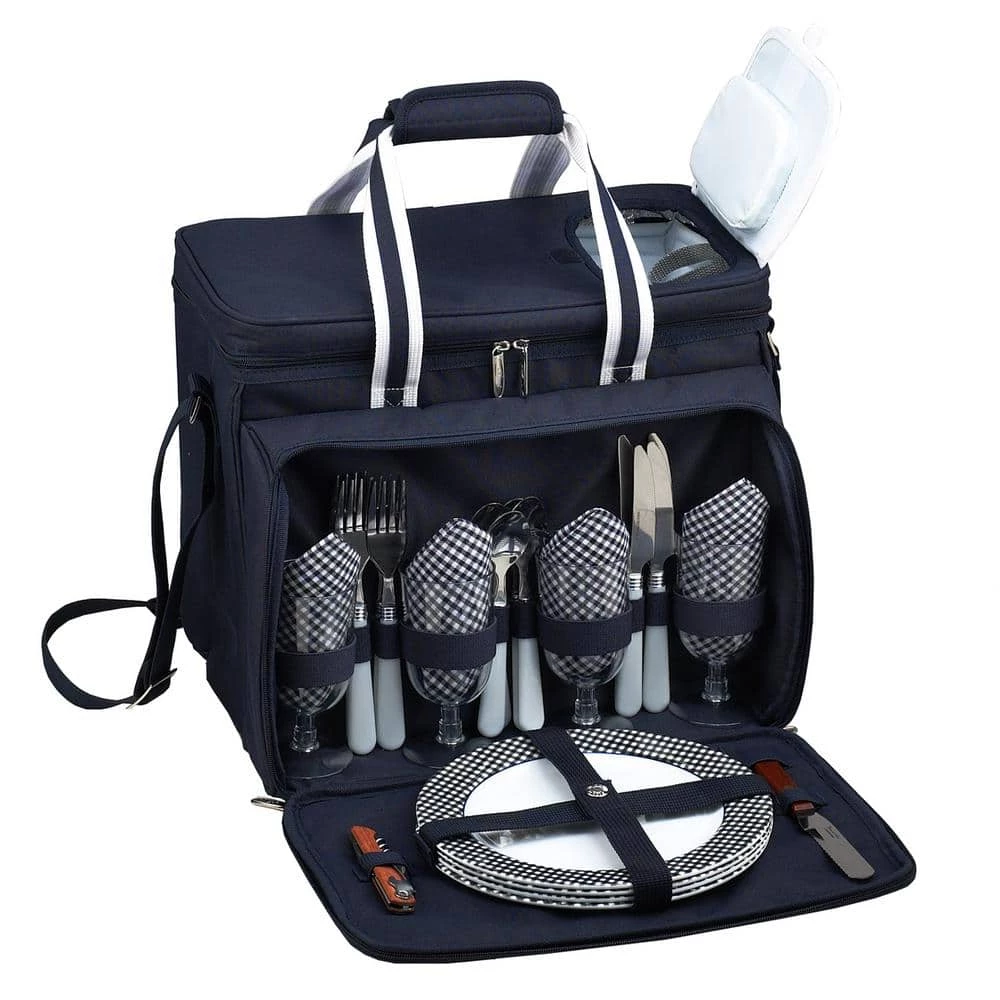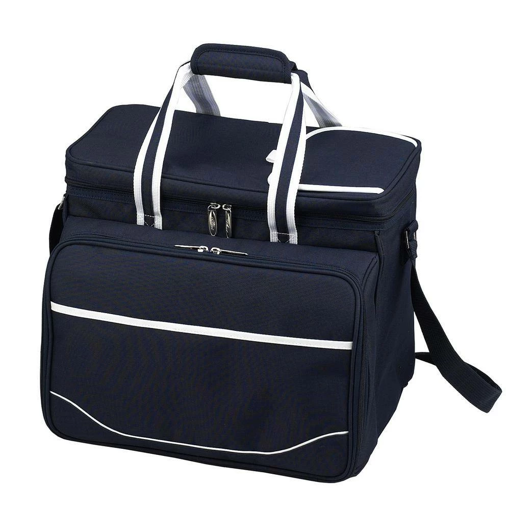 Fully equipped picnic cooler for 4 from our Bold Collection. Unique, divided Thermal Shield insulated cooler with separate sections for wine and food. Divider can be detached and folded to the back when a larger cooler space is needed. Easy drinks access panel in lid. The cooler is leak proof so may used with ice to extend cooling. Includes combination corkscrew, cheese knife, acrylic wine glasses, coordinating melamine plates and napkins, stainless steel flatware. Includes hand grip and adjustable shoulder strap, extra front pocket. 600D polycanvas. Lifetime Warranty.