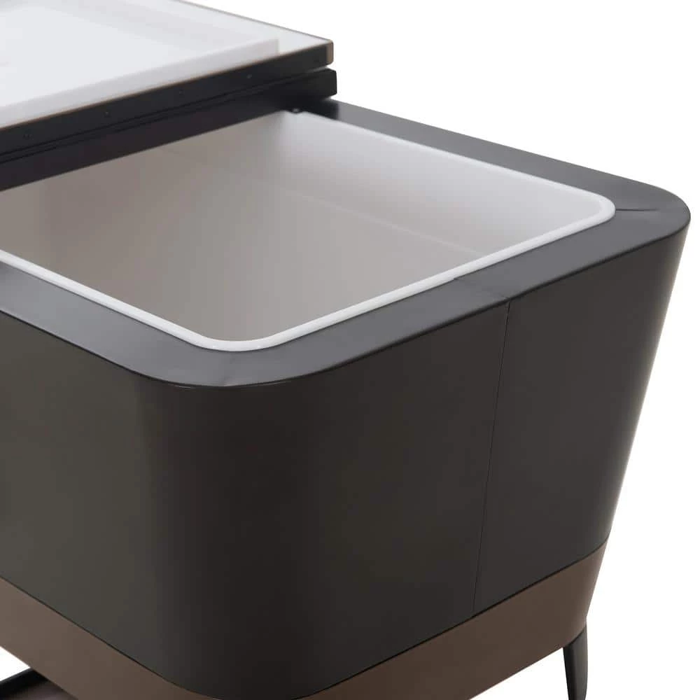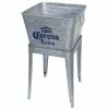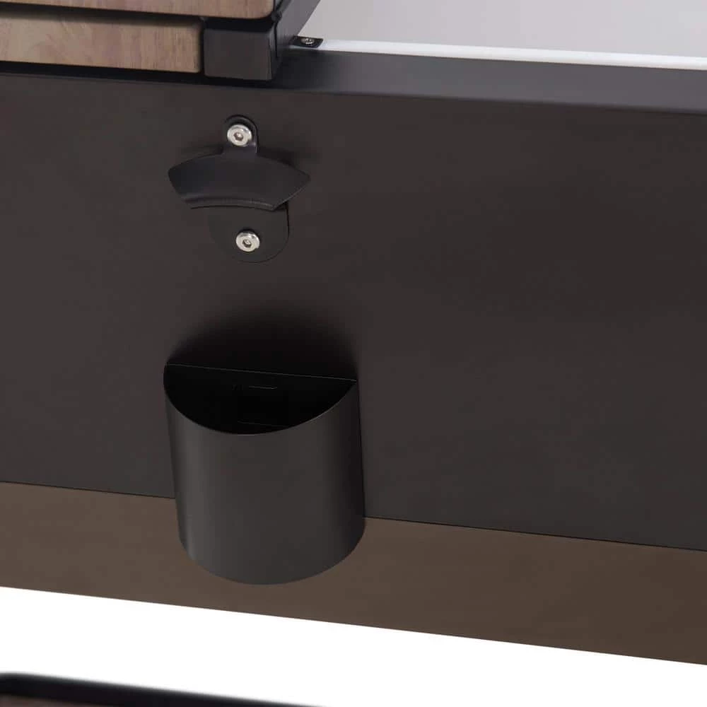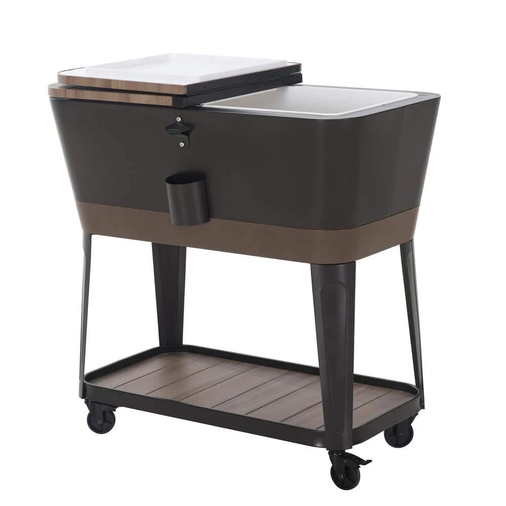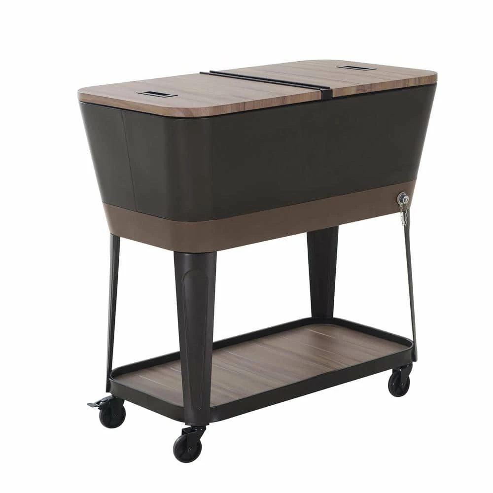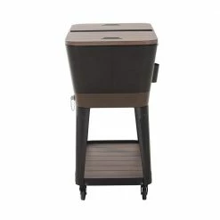 Keep drinks cool in style with this patio cooler cart by Sunjoy. The Durant cooler is made of durable rust-resistent powder-coated steel. The base shelf is a great place for extra storage and the built-in bottle opener with cap-catcher ensures you will always be able to open your favorite beverage. The quality casters with brakes ensure easy mobility. An included stainless steel drain plug makes clean-up a breeze when the party is over.