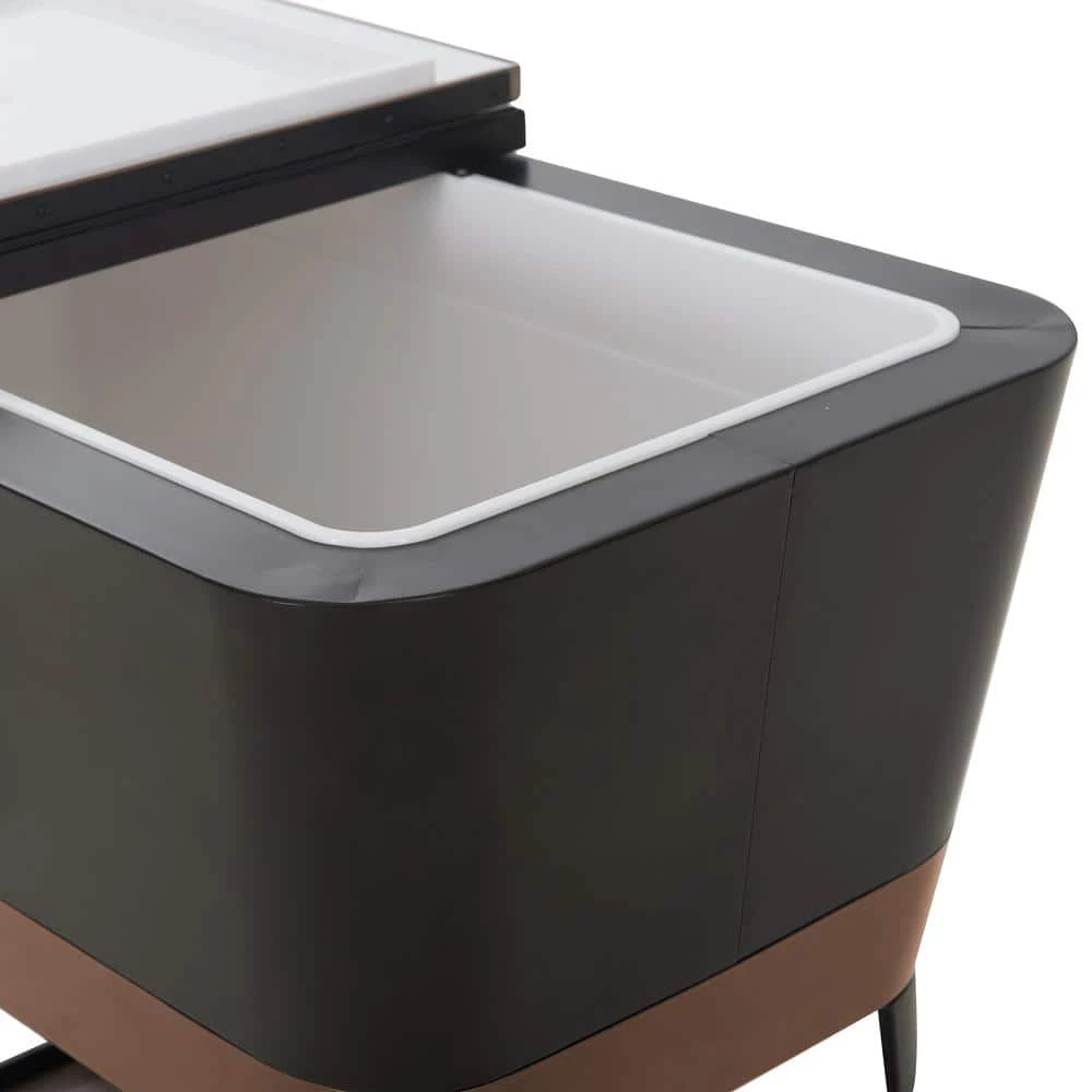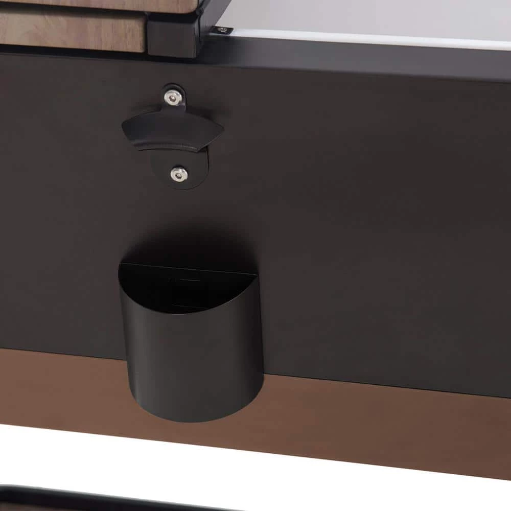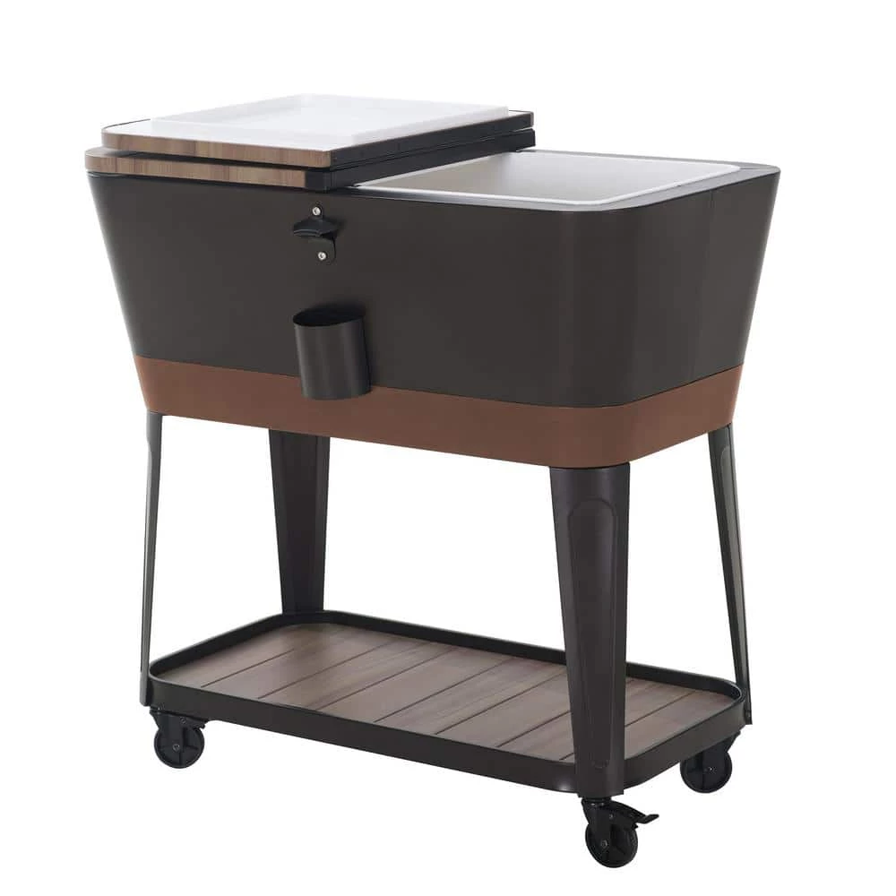 Keep drinks cool in style with this patio cooler cart by Sunjoy. The Durant cooler is made of durable rust-resistent powder-coated steel. The base shelf is a great place for extra storage and the built-in bottle opener with cap-catcher ensures you will always be able to open your favorite beverage. The quality casters with brakes ensure easy mobility. An included stainless steel drain plug makes clean-up a breeze when the party is over.