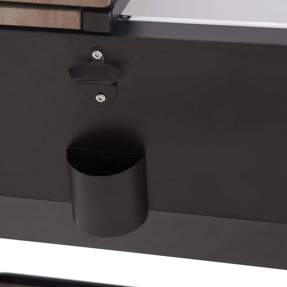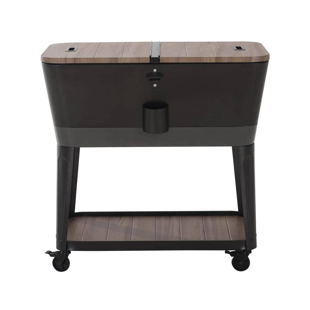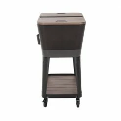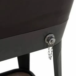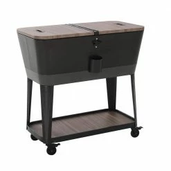 Keep drinks cool in style with this patio cooler cart by Sunjoy. The Durant cooler is made of durable rust-resistent powder-coated steel. The base shelf is a great place for extra storage and the built-in bottle opener with cap-catcher ensures you will always be able to open your favorite beverage. The quality casters with brakes ensure easy mobility. An included stainless steel drain plug makes clean-up a breeze when the party is over.