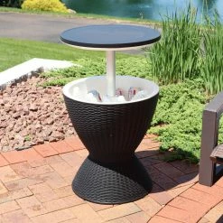 This multi-functional 3-in-1 patio furniture piece can be used as a coffee table, side table, and a cooler. The UV-protected, recyclable polyproplyene and resin construction ensures long-lasting beauty and durability. It features a height-adjustable tabletop that rises from 22.75 inches to 32.25 inches tall. It accommodates up to (40) 12-ounce cans and features a rattan design and neutral color to complement any outdoor living space. The beverage cooler can keep items chilled for up to 6 hours.