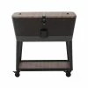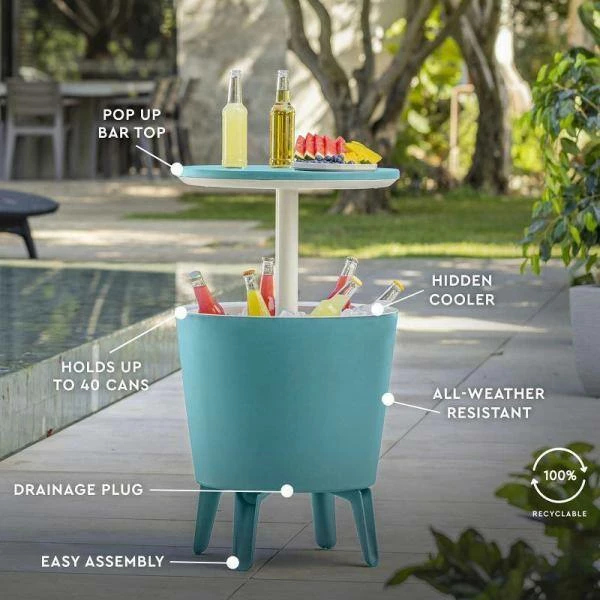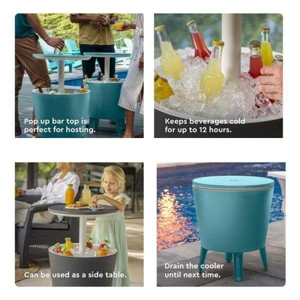 Elevate your next gameday party. This portable bar table allows your guests to grab chilled beverages while never being far from any of the action. Lid elevates upwards 10 in. above the rim for use as a patio bar table. The top reveals a hidden cooler with 7.5 Gal. capacity. Keep up to forty 12 oz. cans ice cold. When not being used as a party bar, shut the top and use as a patio coffee table. When elevated, it is the ideal height for use as a hot tub table so you will always have a spot for your drink, snacks and phone. The thick exterior resin prevents rusting, peeling and denting in all weather conditions, rain or shine.