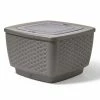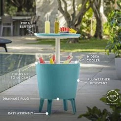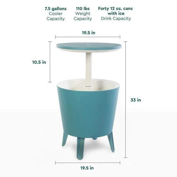 - Lid elevates upwards 10 in. above the rim for use as a patio bar table, the top reveals a hidden cooler with 7.5 Gal. capacity, keep up to forty 12 oz. cans ice cold