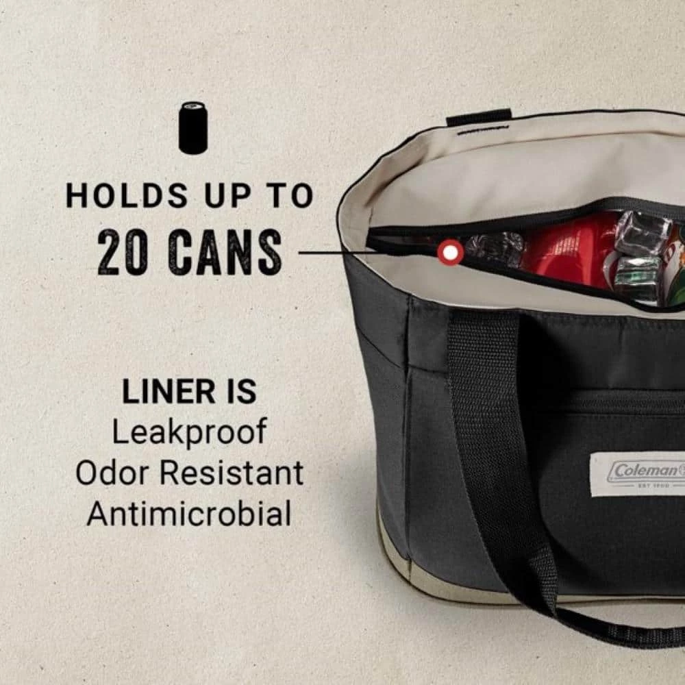 Day at the beach, picnic in the park, or a tailgate with the crew? Coleman® Outlander™ 14Qt 20-Can Soft Thermocooler Tote, Black and Olive is designed to reflect the Coleman heritage and quality you want for getting outside. Food and drinks stay cold for up to 24 hours so you’ll have your favorite snacks and beverages close by while soaking up the sun at the beach or catching up with friends at the tailgate. Padded handles make carrying the cooler from the trunk to the picnic table easy. The zippered front pocket keeps your phone, keys, or wallet secure and durable water-resistant polyester means your items stay dry and a back pocket holds larger items like a magazine or sunscreen. The antimicrobial leakproof liner helps prevent odor, mildew, and mold from forming so you’ll feel confident using this cooler again and again.